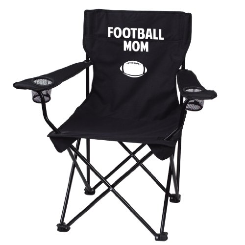 This black camping chair is perfect for you next football game!  The chair comes with a "Football Mom" design on the inside back panel. Chair is made of durable black fabric.  Double armed chair with a cup holder in each arm.  Sturdy steel fold-up frame.  Black nylon carry bag with shoulder strap included.  **Please note maximum load complicity is 300 pounds.**