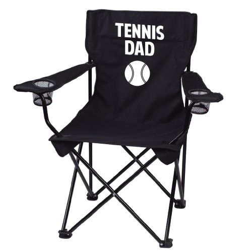 This black camping chair is perfect for you next tennis meet!  The chair comes with a "Tennis Dad" design on the inside back panel. Chair is made of durable black fabric.  Double armed chair with a cup holder in each arm.  Sturdy steel fold-up frame.  Black nylon carry bag with shoulder strap included.  **Please note maximum load complicity is 300 pounds.**